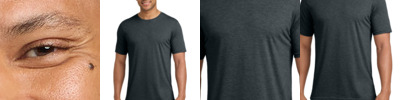 3.5-ounce, 65/35 poly/combed ring spun cotton, 40 singles Solid colors: Black, White, Shiraz, Smoked Paprika and Stonewash Green (the remaining colors are heathers) 1x1 rib knit neck Double-needle edge stitch at neck Shoulder to shoulder taping Satin label Side seamed