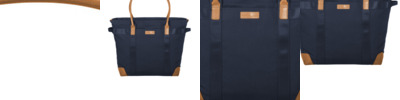 Whether you're going into the office or on a weekend trip, this tote has all the features you need to keep your technology safe and secure. 12-ounce cotton canvas with DWR finish Leather trim and details Metal zippered main compartment Padded laptop compartment Front pocket with snap closure Leather carry handles Side seatbelt webbing handles Leather zipper pulls with Brooks Brothers logo Exterior debossed Brooks Brothers leather label Luggage trolley pass through on back Laptop compartment: 11'h x 14'w Dimensions: 14'h x 15'w x 7'd Capacity: 1,792 cu. in./29.3 L Weight: 2.54 lbs./1.15 kg Note: Bags not intended for use by children 12 and under.