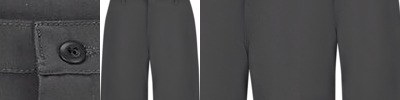 - Two slack-style front pockets, two set-in hip pockets, and left pocket with button closure