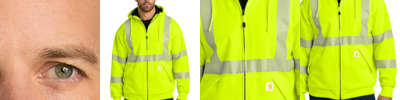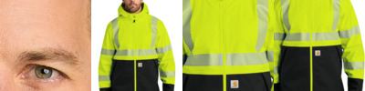 10.5-ounce, 100% polyester Meets ANSI 107 Class 3, Type R visibility standards 3M Scotchlite reflective material segmented for breathability Rain Defender ® durable water repellent Three-piece adjustable hood 100% polyester thermal lining with thermal-lined hood Locker loop Vislon ® center front zipper with storm flap Two front handwarmer pockets with flaps for security Interior left chest hidden media pocket Hidden media pocket inside right handwarmer pocket Stretchable, spandex-reinforced, rib knit cuffs and waistband Carhartt label sewn on left handwarmer pocket Reflective material maintains performance through 75 home launderings Loose fit This garment must be fully zipped to be in compliance with ANSI/ISEA 107 standards