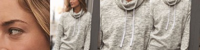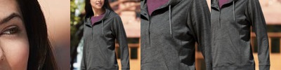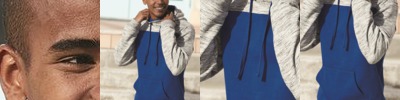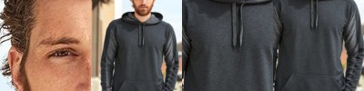 - Contrast melange fleece on hood, shoulders, and sleeves