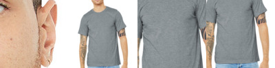 Retail fit Tear-away label Side seamed Solid Colors: 4.2-ounce, 100% Airlume combed and ring spun cotton, 32 singles Athletic Heather/Black Heather: 90/10 Airlume combed and ring spun cotton/poly Dark Grey Heather: 4.2-ounce, 52/48 Airlume combed and ring spun cotton/poly, 32 singles Neon Blue: 3.6-ounce, 52/48 Airlume combed and ring spun cotton/poly, 40 singles Triblend Colors: 3.8-ounce, 50/25/25 poly/Airlume combed and ring spun cotton/rayon, 40 singles